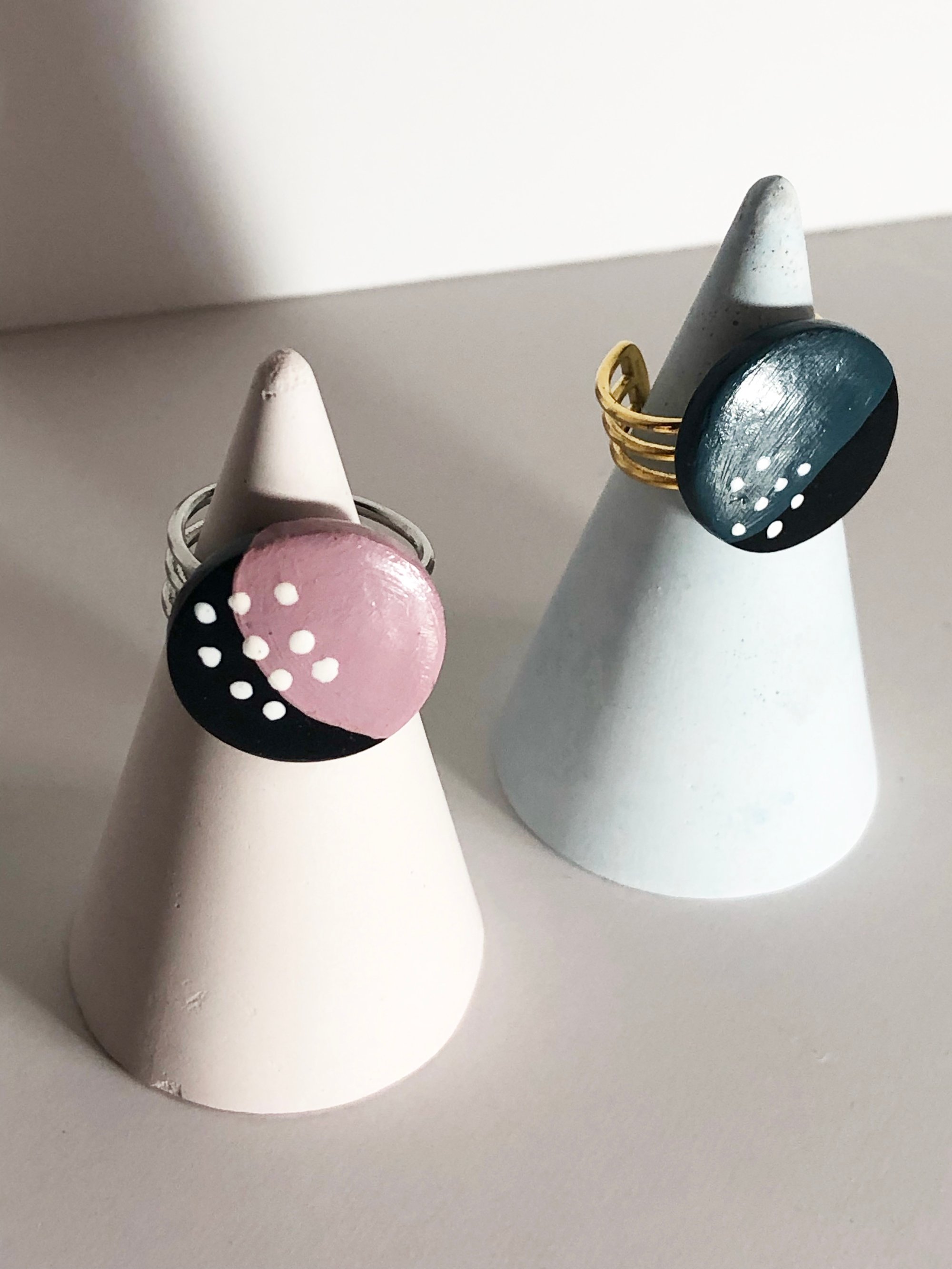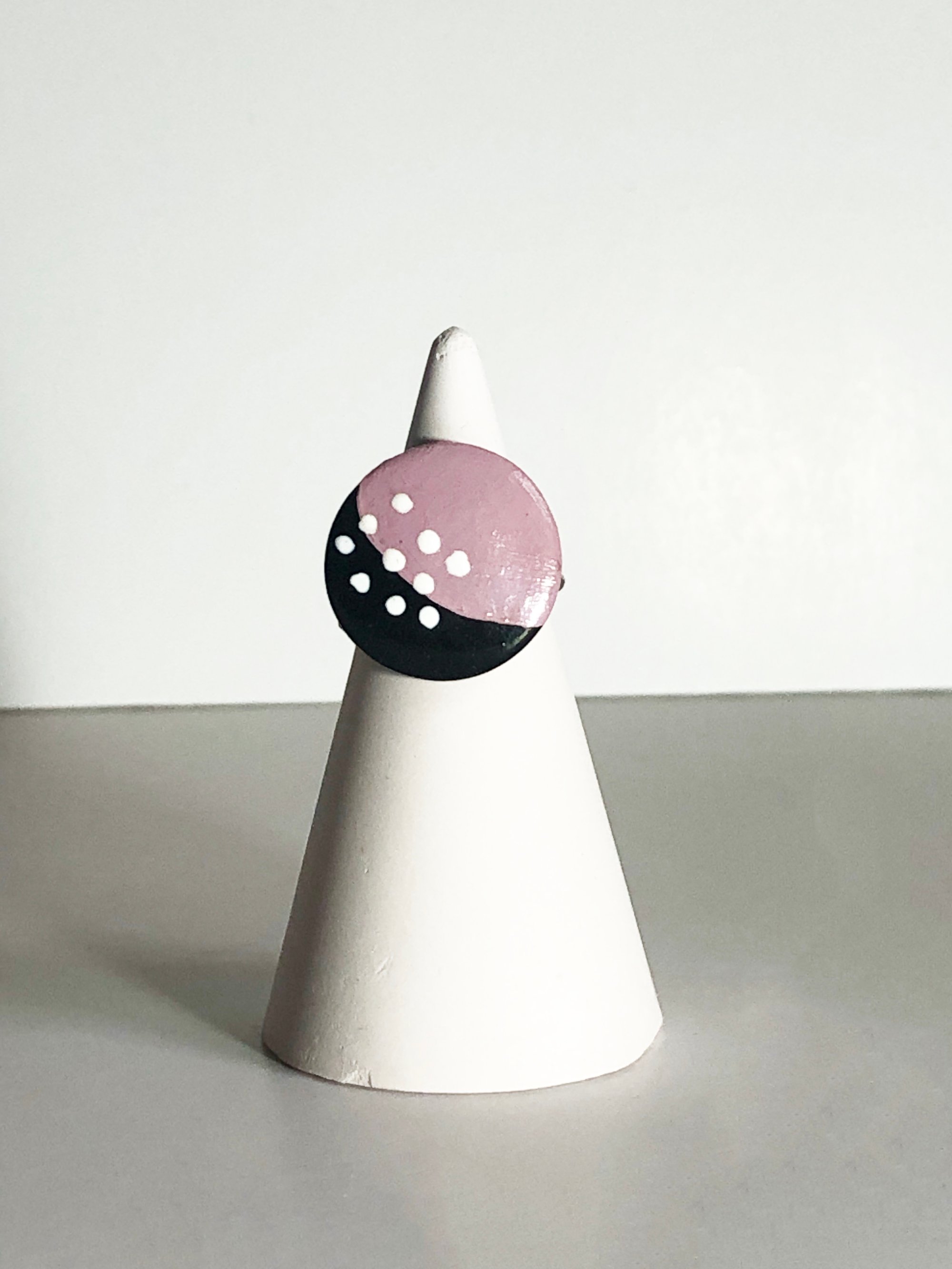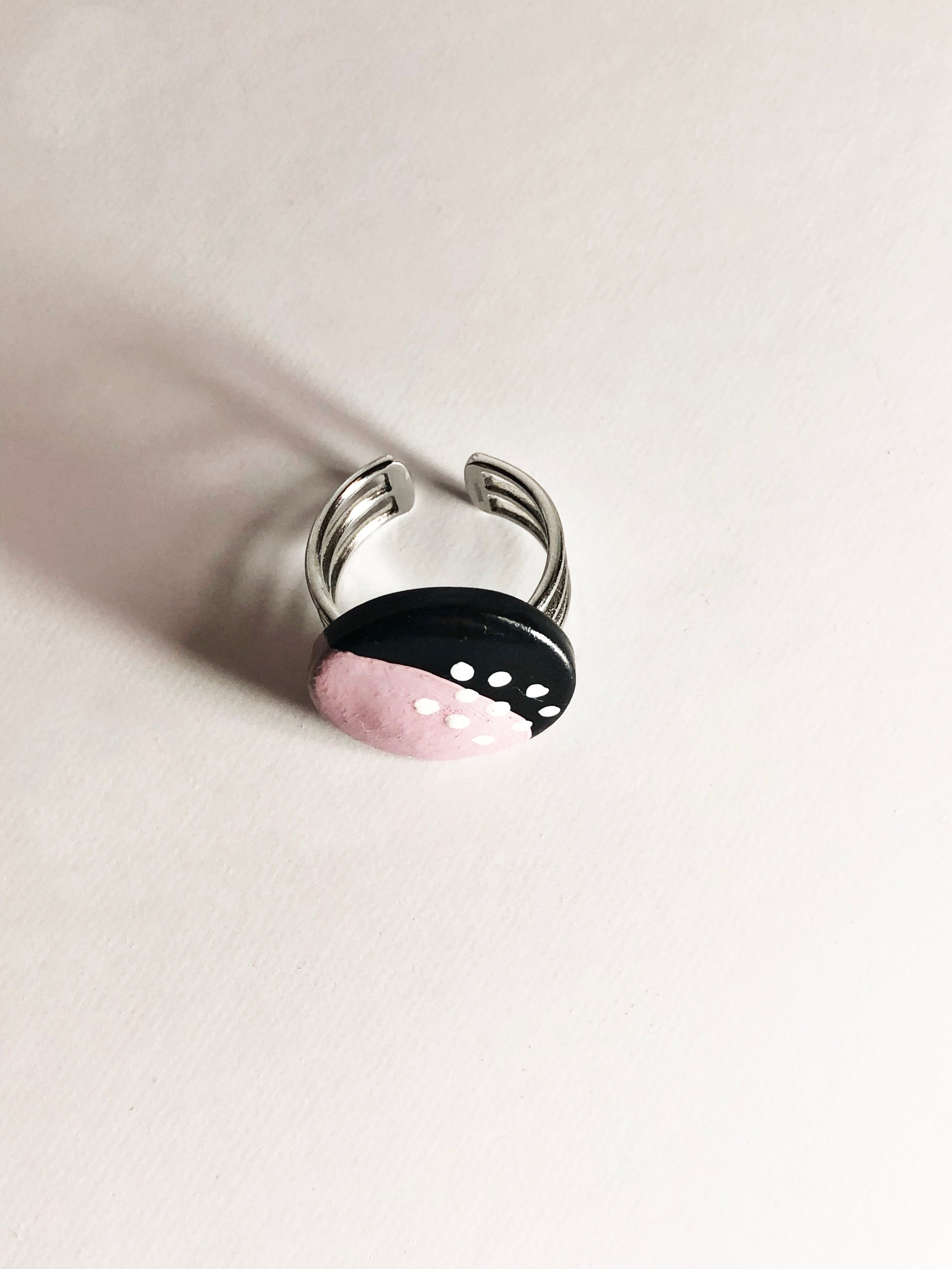 Con base de acero inoxidable plateado ajustable y pieza de arcilla polimérica modelada, pintada y barnizada a mano.