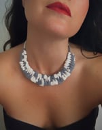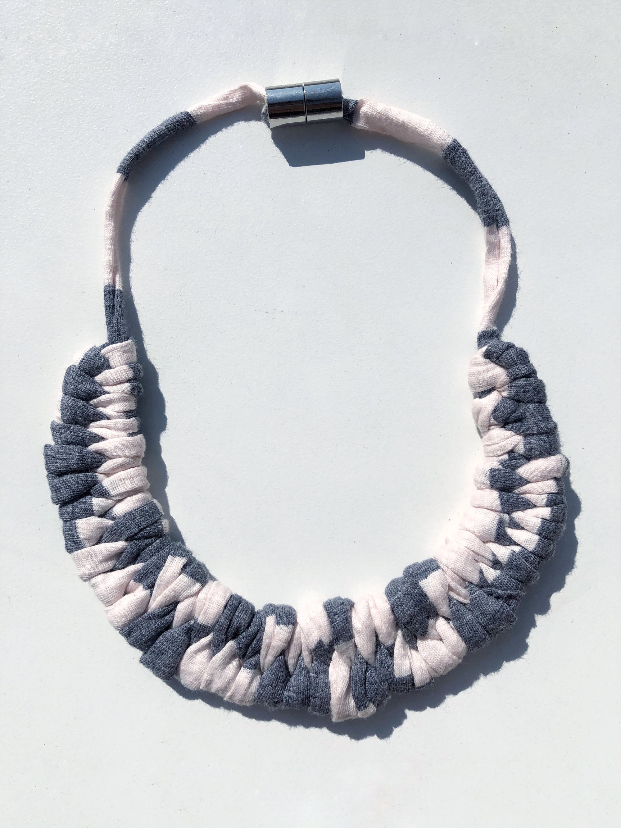 Collar de tela gris y blanco con cierre magnético de latón color plateado.