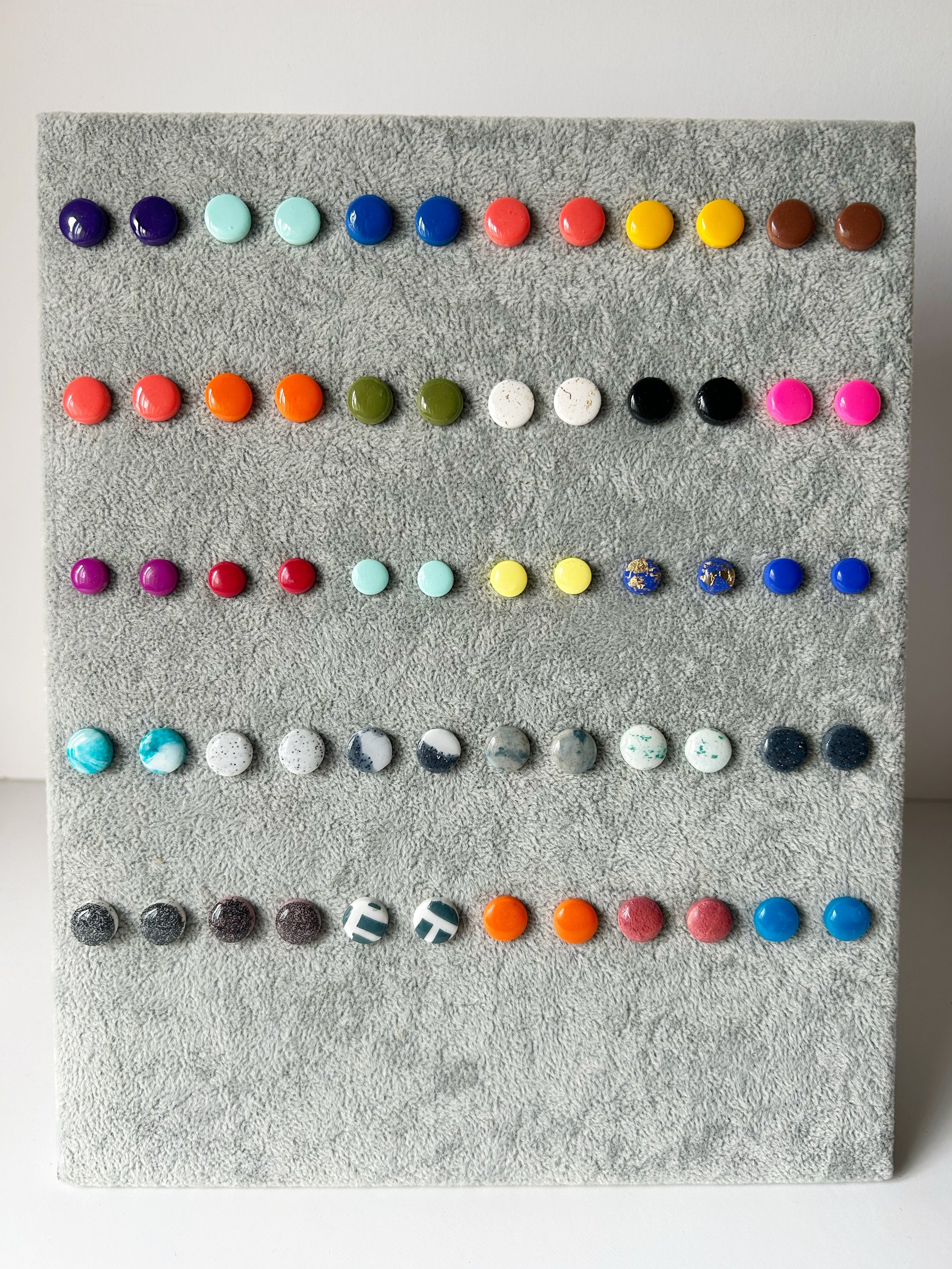 Pendientes mini modelados a mano con acabado en resina y cierre de acero inoxidable hipoalergénico.